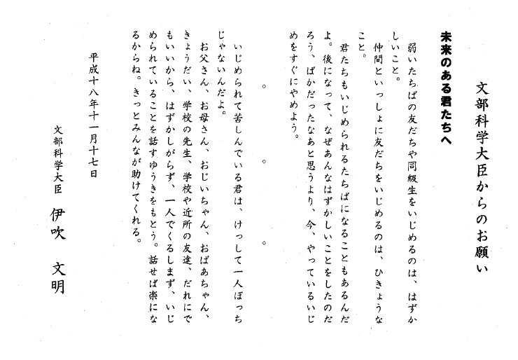 お父さん、お母さん、おじいちゃん、おばあちゃん...と並べ立てた中に、国・もしくは伊吹大臣の名がなかったのは残念。「だれにでもいいから」とか中途半端な事言ってるんだし。これでは「何通も自殺予告が殺到して、対応が面倒になっただけ」という印象しか残らない。 もちろん、自殺予告にいちいち対応していたら本来の業務が進まない、というのはわかるけれど。 しかし、こんな文面を出したところで予告の手紙が減るとも思えないし、どのみち数ヶ月も経てば“自殺予告ブーム”も終わるんだから、「困ったことがあったら私が聞きます。私に相談してきてください!」くらい言ってもいいと思うんだが。一時的に手紙は殺到するだろう(それでも手紙が来ないようなら、政治はもう完全に機能不全ですね。)けれど、伊吹大臣が国民的ヒーローになるチャンスだったのになぁ。 |